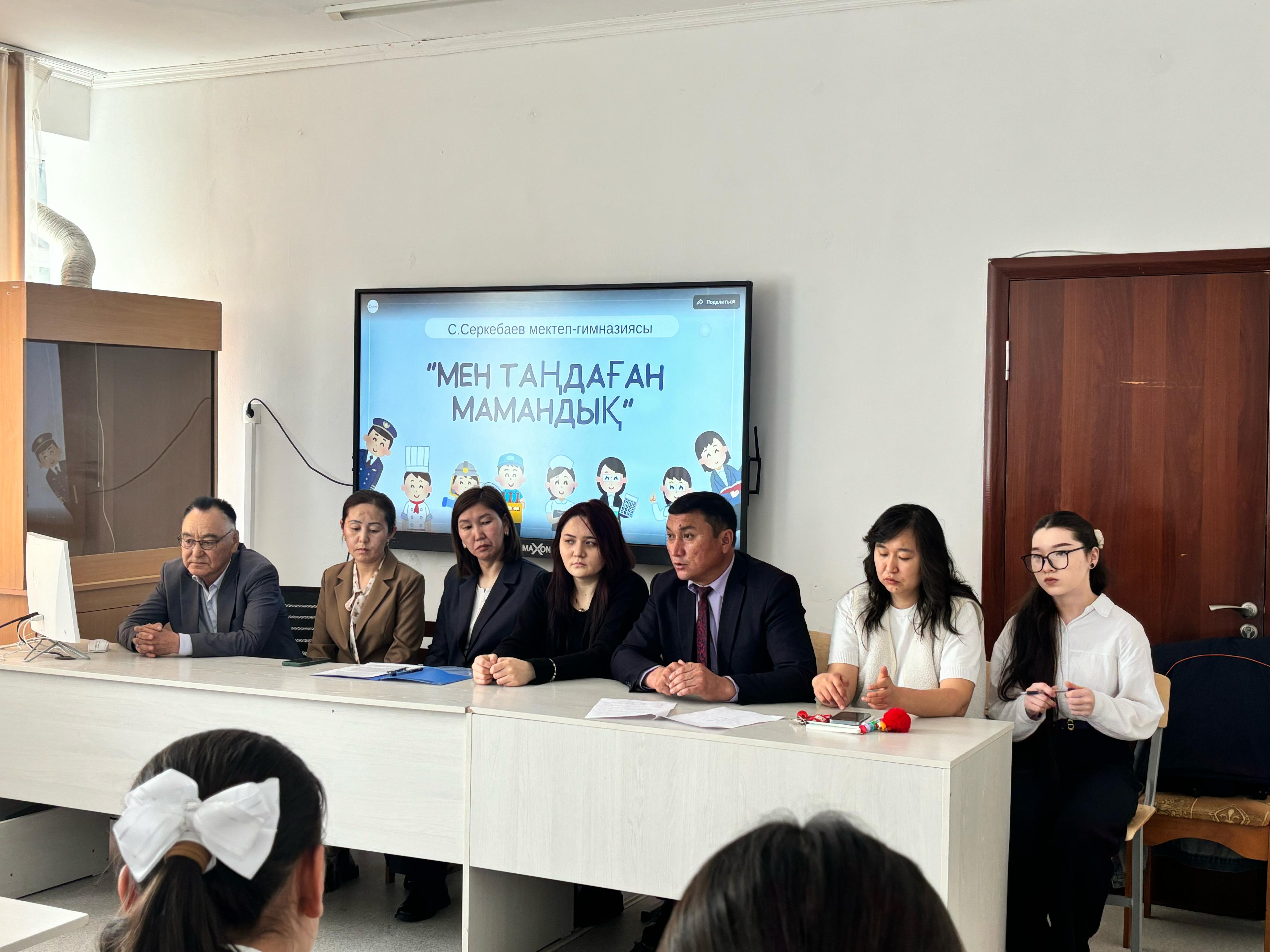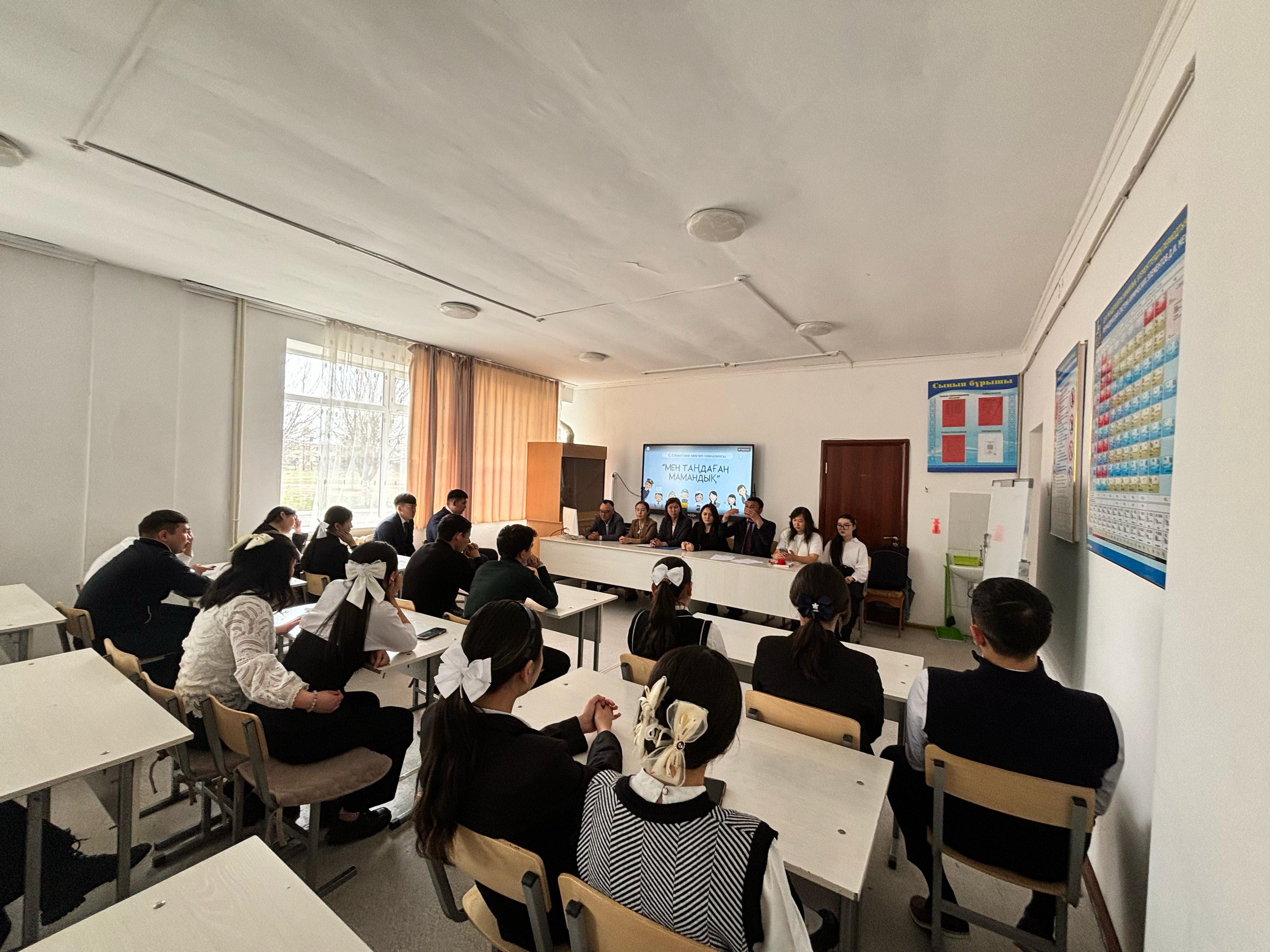 11 сынып оқушыларымен "Мен таңдаған мамандық" тақырыбында кездесу өткізілді. Мақсаты: оқушылардың ойлау қабілеттерін дамыта отырып, болашақ мамандыққа байланысты ұғымдарын тереңдетіп, қызығушылықтарын арттыру. Жұмыстың мазмұнымен, мағынасымен айрықшаланатын мамандық әлемінің түрлілігі туралы түсінік қалыптастыру.Оқушылардың бойына жақсы қасиеттерді сіңіру, мамандық таңдай білуге, еңбексүйгіштікке тәрбиелеу.